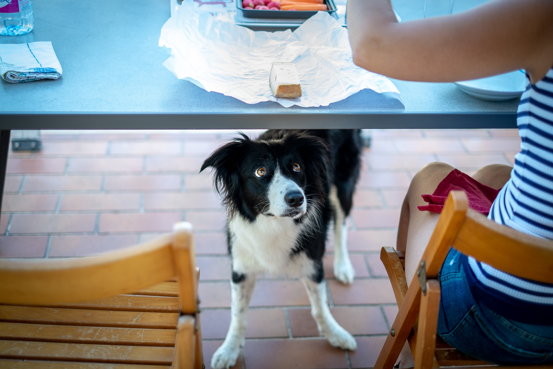 Full shot of Heaven, a black and white border collie, eyeing a slice of cheese from under the table.