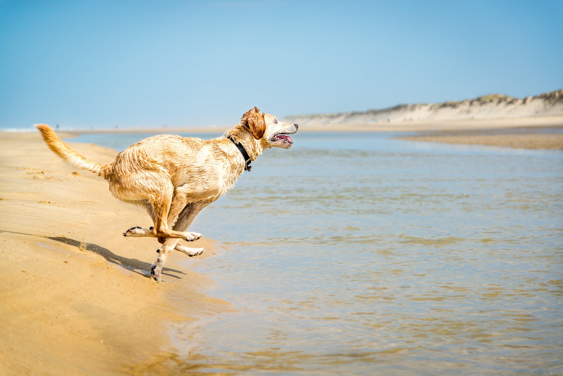 Long shot of Pilou, a labrador retriever mix, about to jump in a pool of water on the beach.