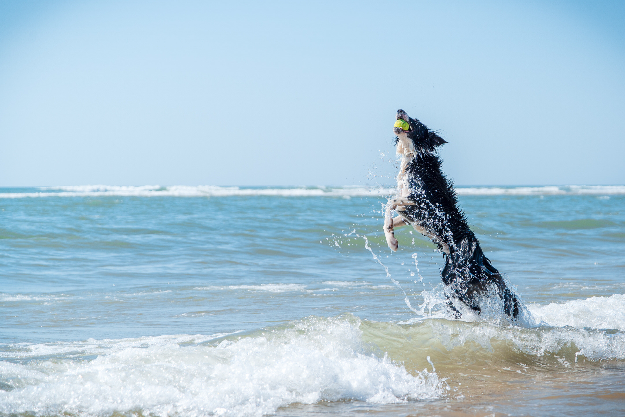 Long shot of Heaven, a black and white border collie, jumping and catching a tennis ball in shallow water on the beach.