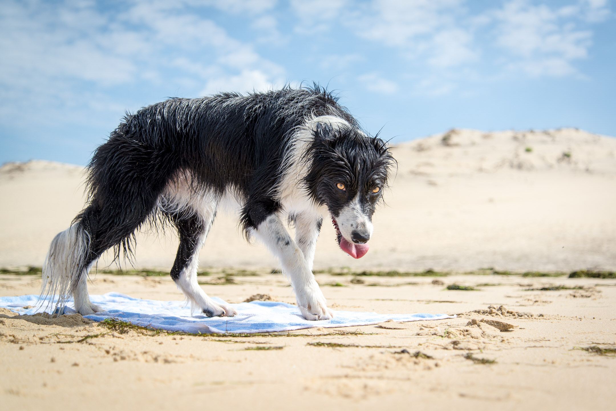 Full shot of Heaven, a black and white border collie, about to lay on a light blue towel on the beach, after playing in the waves. Still standing, with her wet fur, her tongue dropping from her mouth and one of her front paw still advancing toward the camera, she looks majestic and dangerous.
