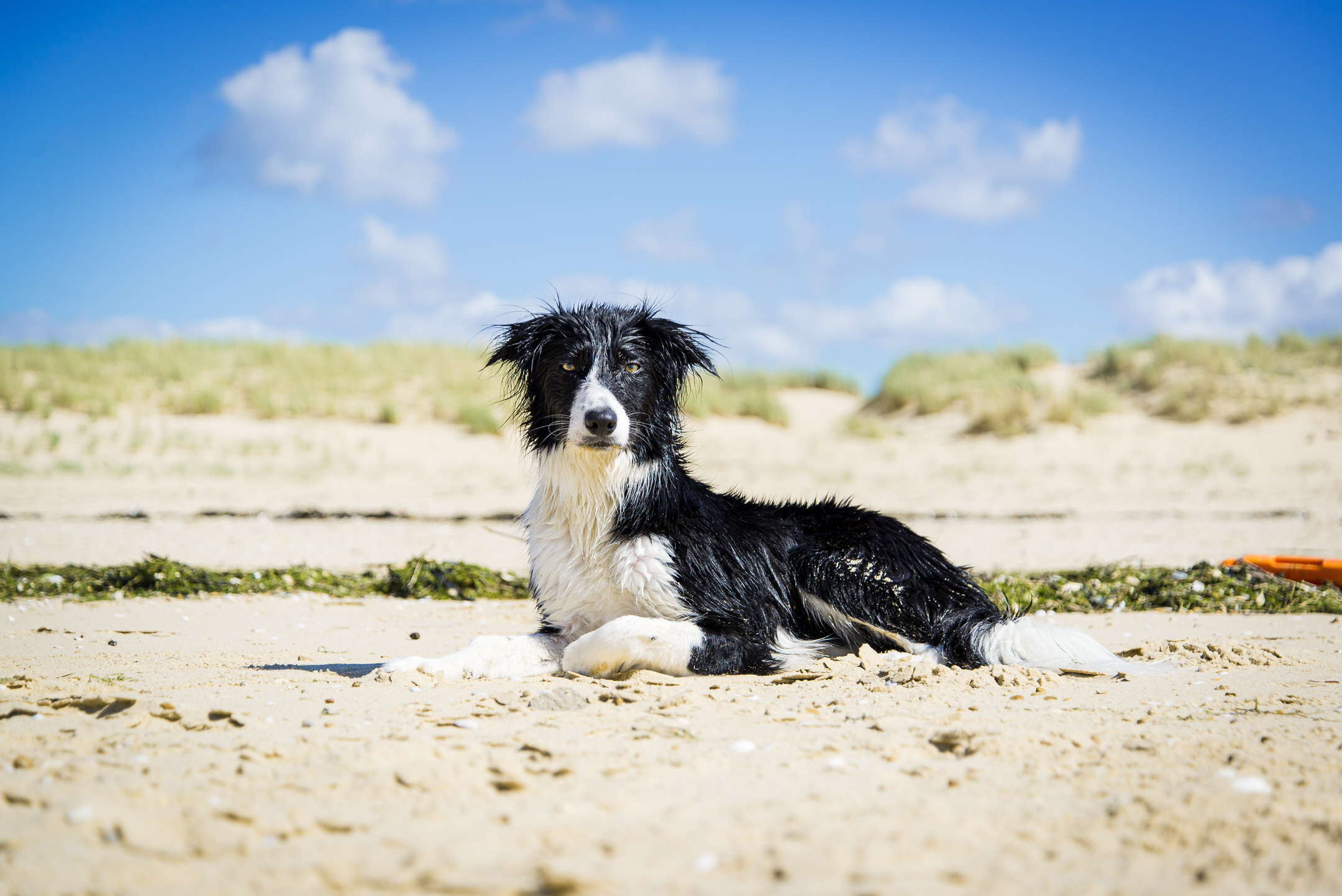 Long shot of Heaven, a black and white border collie, sitting on the beach and looking intp the distance over the spectator's head.